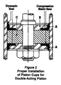 Figure 2 illustrates two Piston Cup packings (A and A) which are installed back to back against a common backing plate C in a double-acting cylinder. B serves as the follower plate to compress the static seal. A good solid plate is provided which is a piston head. Packings should not be installed without a backing plate between them.